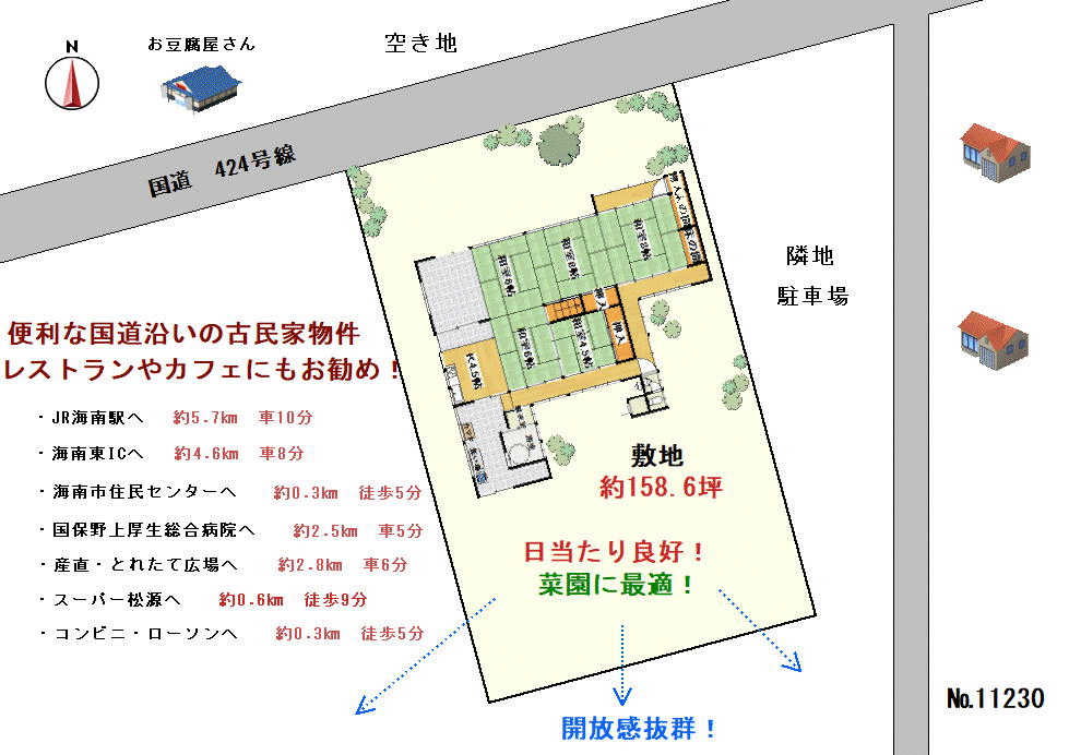 阪和自動車道「海南東」ICより、東へ車で約8分のところ。国道424号線沿いの古民家物件です。スーパー松源やローソンが徒歩圏内にあり、生活に大変便利!敷地は約158.6坪の平坦地、南方向に開けていて日当たり抜群!遠方に山の稜線が続く景色が広がり、心が和みます。敷地の南側(約30坪ほど)が、現況更地の状態ですので、庭や家庭菜園等、お好みのまま自由に楽しめます。建物の古民家(築年数不詳)は、しっかりしており、手を入れればまだ十分住むことが出来ます。古民家ファンにはリノベが楽しみな魅力物件!駐車場を作ることは可