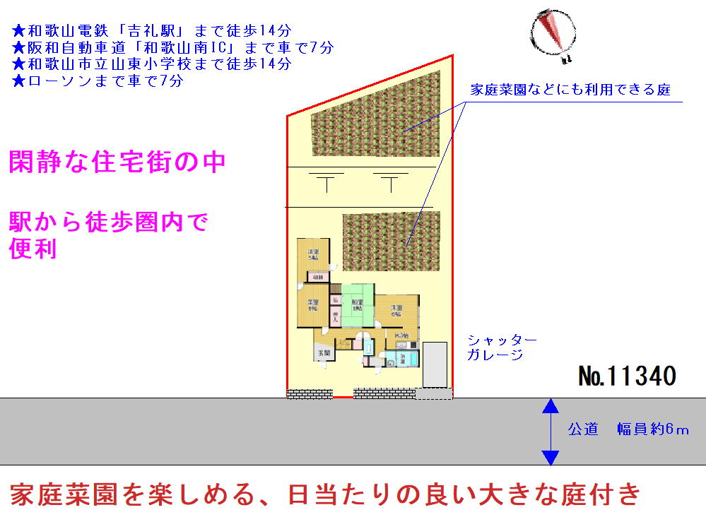 和歌山市郊外の閑静な住宅街の中に物件はあります。駅まで徒歩圏内であるにもかかわらず、敷地内には約100㎡の菜園用地もあり、気に入った草花や作物を育てて楽しめます。建物は築40年以上経っていますが内部の状態は比較的良く、少しのリフォームを施すことにより、まだまだ使える住まいに生まれ変わる事でしょう。便利な場所で庭を楽しみながら、のんびりとした生活を営むのに最適な住まいです