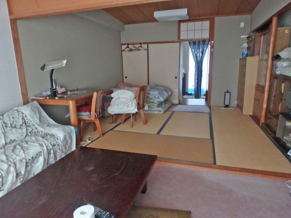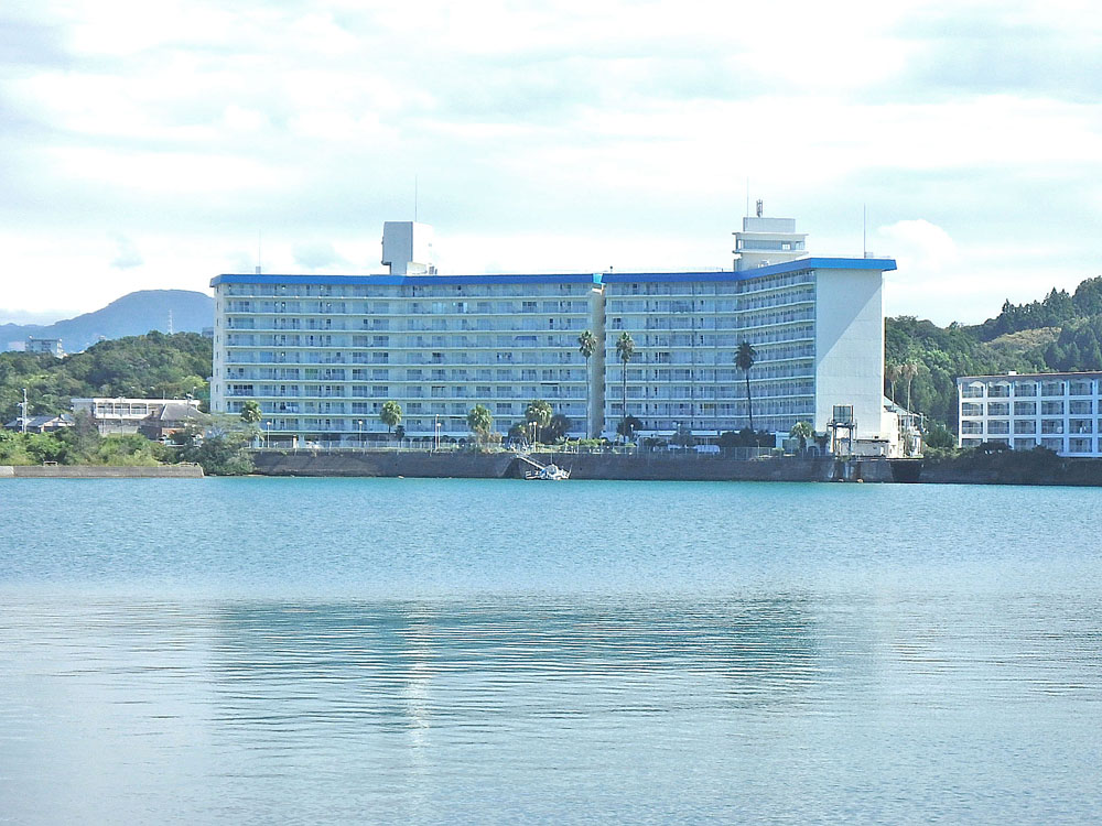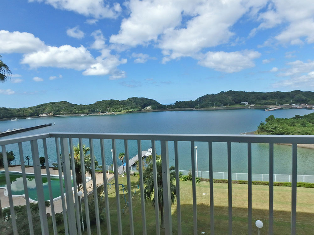 テラスからの眺めは、みどりの芝生、プールそして海、浮かぶ島と眺望良好なかけ流し温泉付きリゾートマンションです。r目下、荷物はそのままの状態です。