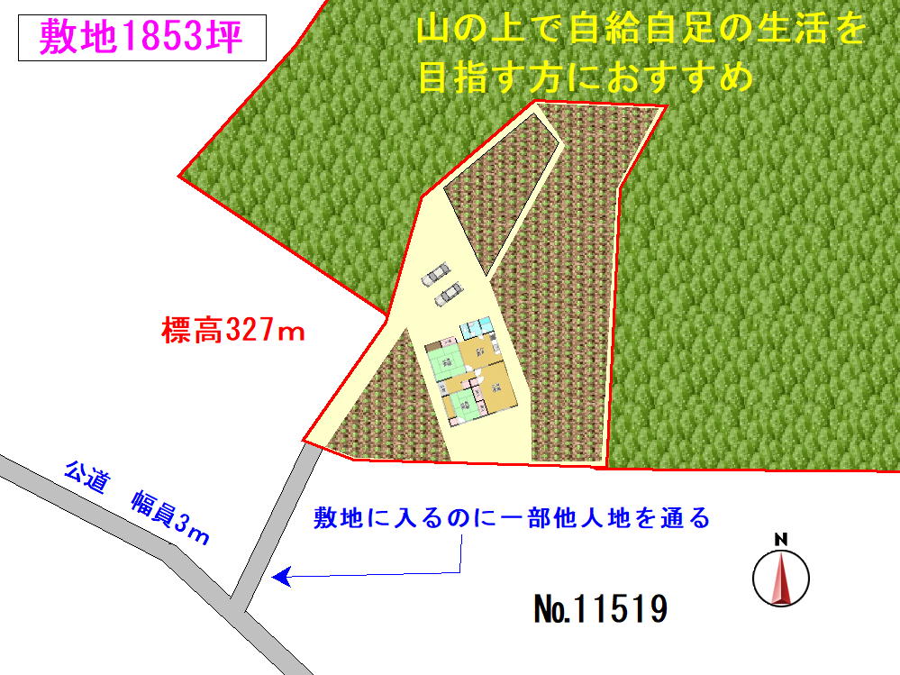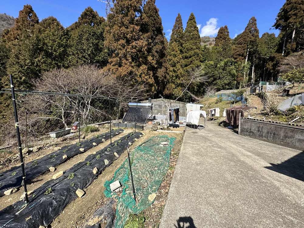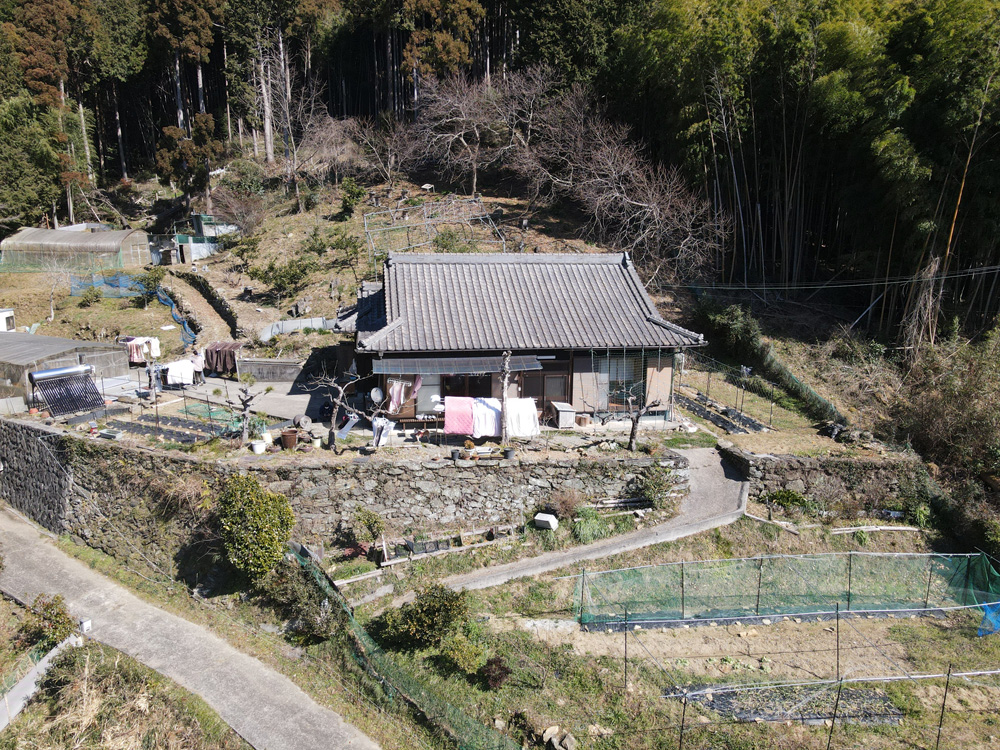 紀の川市の山奥で人里離れたところにある物件。現在の所有者はほぼ自給自足の生活をしています。敷地までは道幅の細い林道を通る必要があるので、部外者の通行はほぼないようなところ。標高300m以上の敷地からみる景色は絶景です。現地に水道はなく山からの湧水を利用して生活されています。敷地から直接公道に接してはいません