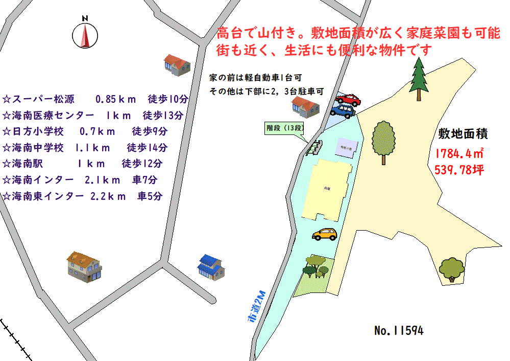 高台で山付き、家庭菜園も可能、買い物も近くて便利!
