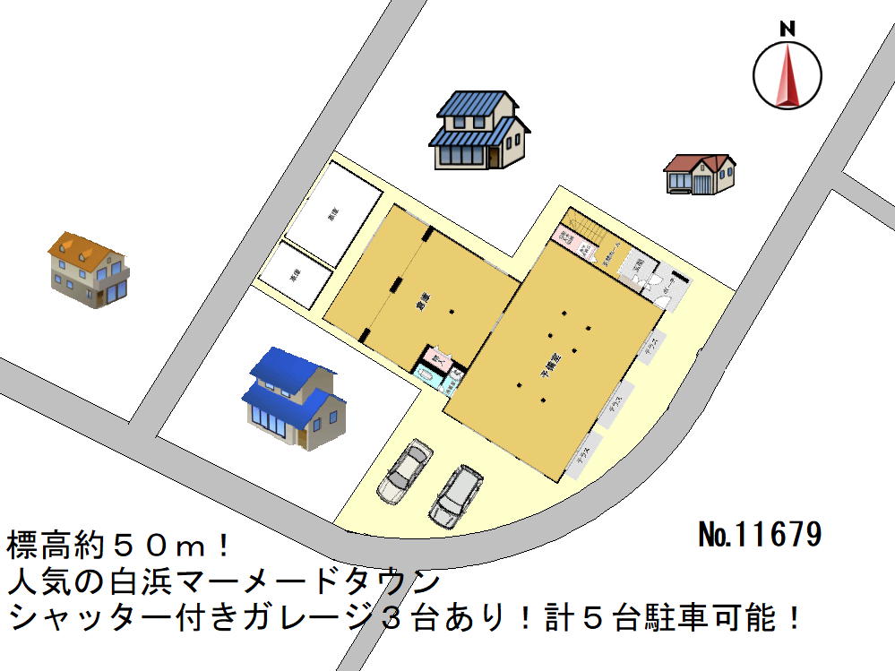 標高50m、津波・洪水の心配がない高台の閑静な住宅街にあります。人気の大和ハウス施行。日当たりも良く、1階は多目的ホールと倉庫、2階が居住用の4LDKとなっています。温泉引き込みもでき、屋外2台、車庫3台駐車可能です。JR白浜駅・オークワ白浜堅田店まで徒歩15分、とれとれ市場まで車4分と移動やお買い物も便利です