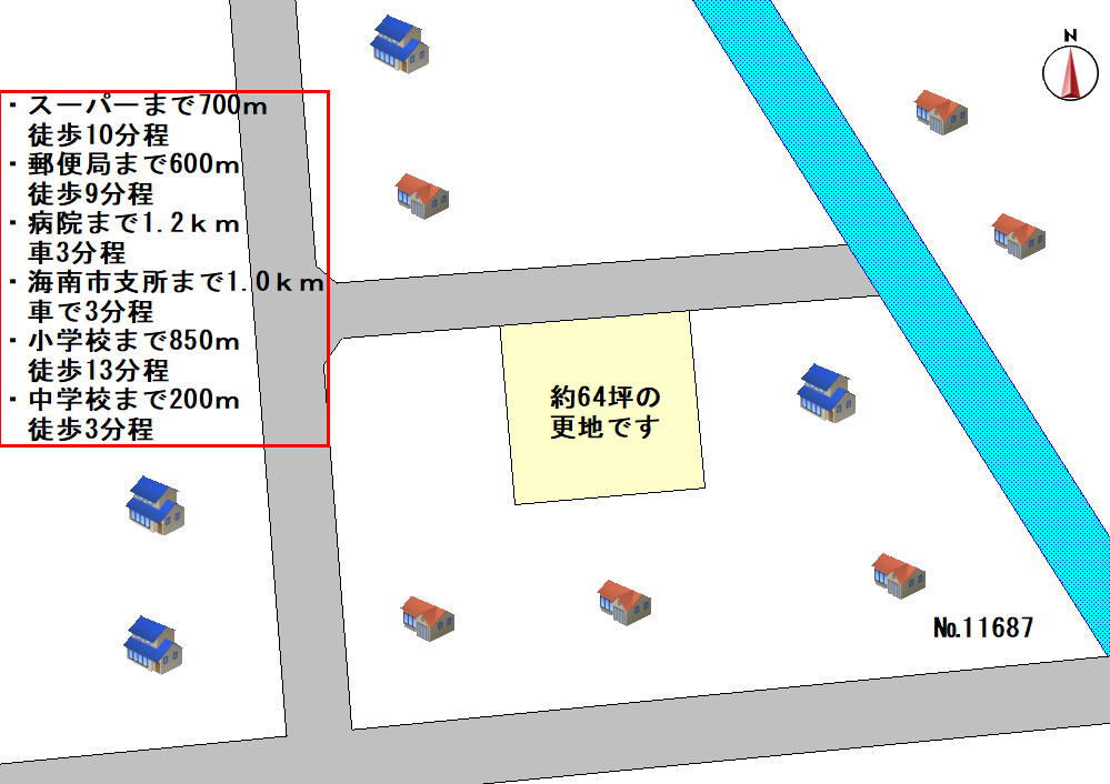 JR海南駅からは車で16分程、海南東ICから車で10分程の場所にある物件です。徒歩で10分程の場所にスーパーオークワがあり、郵便局や、総合病院も徒歩圏にあるので、買物・生活に便利です。また、小学校、中学校が近くにあるので、これから子育てをされる方にお勧めです