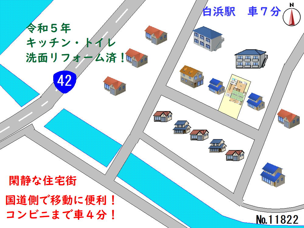 国道42号線側にある閑静な住宅街の中にあり、日当たり良好!部屋数も多く、ファミリー層や二世帯の方にオススメです。駐車場もカーポート付きと青空の2台分確保されており、門扉を取り払えばもう一台駐車可能。令和5年にリフォームがされており、室内もとても綺麗です。北富田小学校まで1.2㎞、白浜中心街まで車で14分、上富田町役場まで車で11分と通勤にも便利な場所にあります
