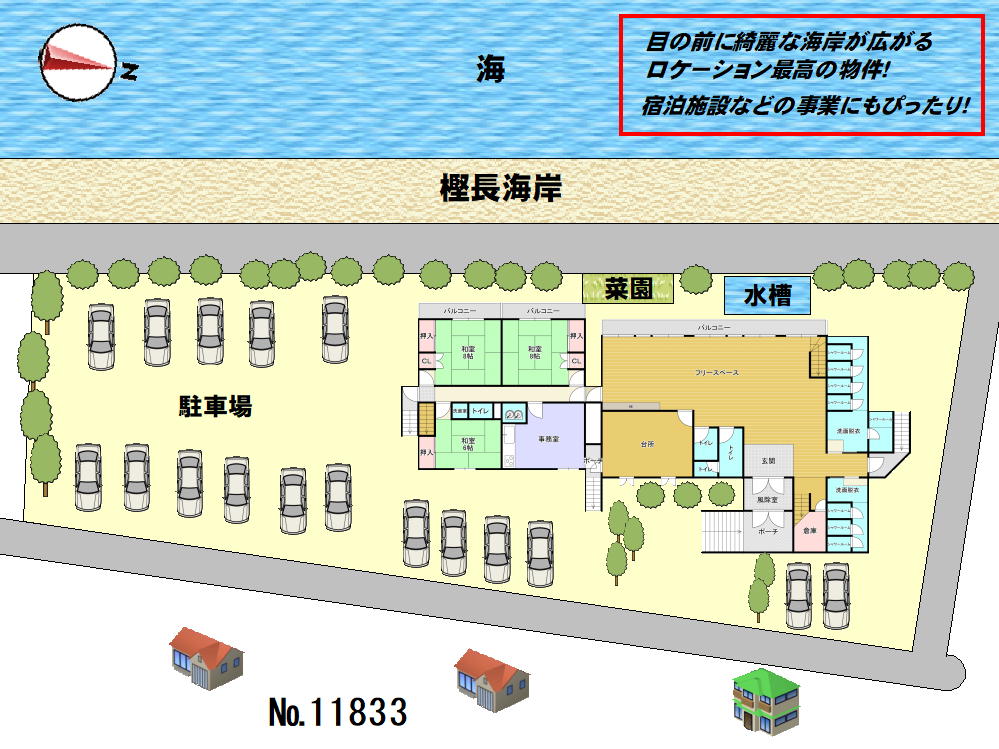広川ビーチが目の前の景観の良い場所にある観光ホテル。全室オーシャンビューの客室とロビー・食堂、娯楽室、3LDKのオーナールームがあります。駐車場も広いです。駐車場には、ソーラーパネルが設置されていて、年間約200万円の売電収入があります。夏場は、海水浴客の利用が多いです。 2021年に室内を改装していて、手入れ良好です。宿泊施設以外に、介護施設等への転用にも向きそうです