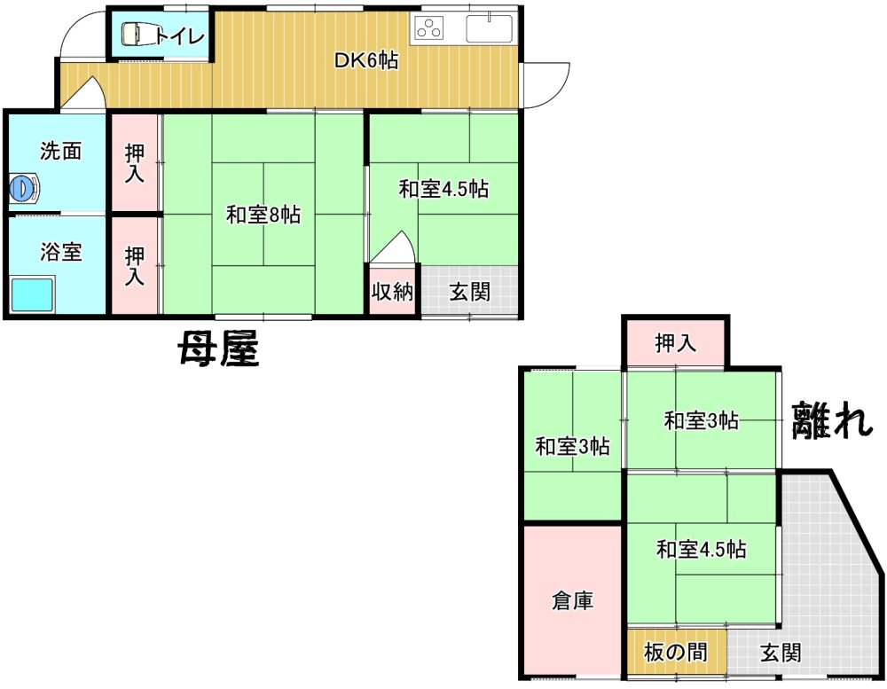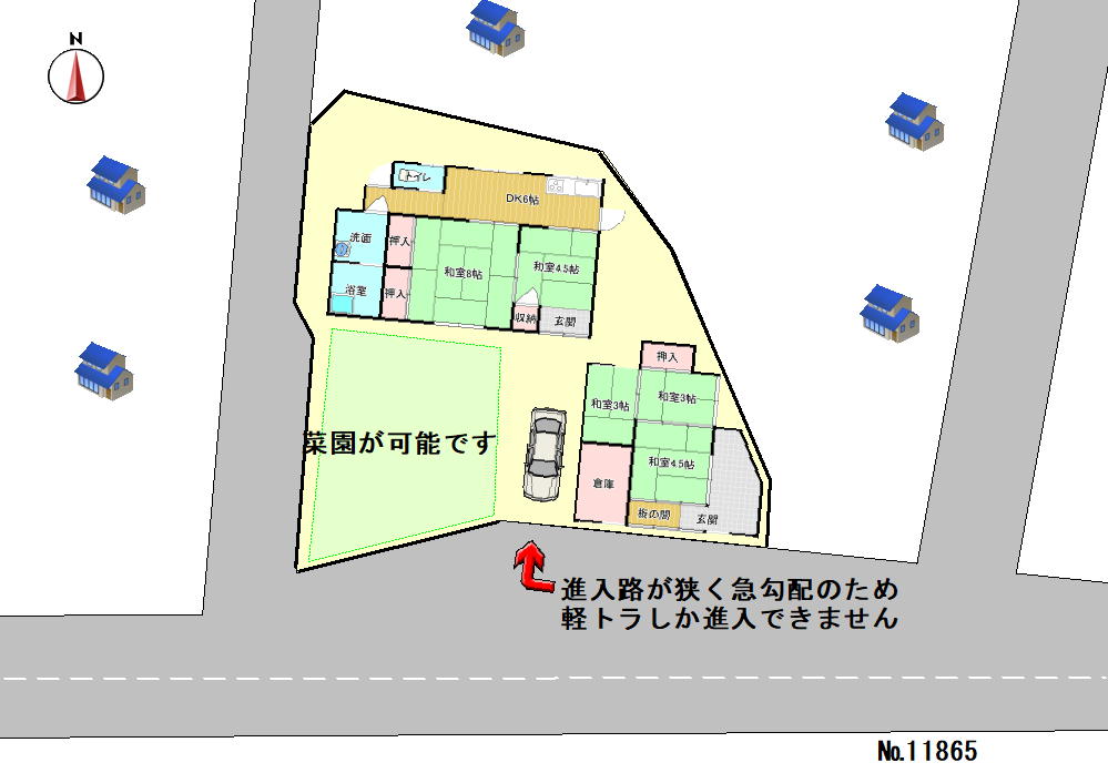 車で5分以内に、スーパー、コンビニ、ドラッグストア、ホームセンタ―など、があるエリアなので、生活はとても便利な場所になります。建物は2DKの木造平屋と3部屋ある木造平家の2棟建っています。2DKの建物は手を加えられていて、3年程前まで利用されていました。3部屋ある建物はリフォームが必要です。敷地内では菜園が可能です。南向きなので、日当たり良好です。敷地への進入路が狭く、急勾配のため軽自動車しか進入できません
