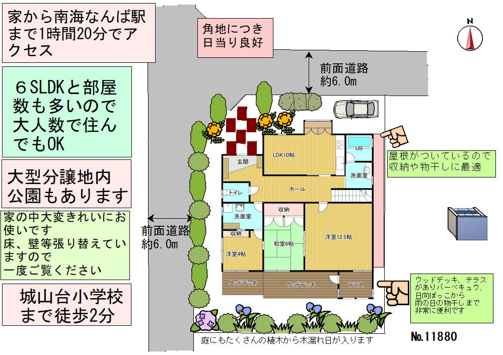 大阪中心地へのベッドタウンとして南海高野線1本で約1時間20分ぐらいで大阪なんば駅までアクセスできます。また車でも11分ほど走ってトンネルを越えると大阪の河内長野市に入る立地です。城山台小学校までは徒歩2分の距離にあり、開発の大型分譲地ですので分譲地内に大きな公園もあります。前面道路も6mと広くとってあり角地ですので日当たり良好です。建物は床、壁の張替、キッチンの取り換え、増築などまめにしているので家の中も非常に美しく大切にお住まいになっていたのがわかります。ウッドデッキの上部、東側の敷地の上部にテラス屋根を施工していますので濡らせずに物を保管できます。
