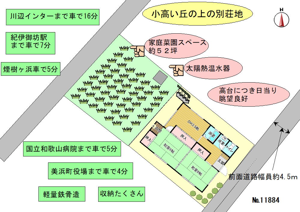 小高い丘の上の別荘地ですので日当り、眺望良好です。高速道路川辺インターまで車で14分、御坊駅まで車で7分、煙樹ヶ浜まで車で5分、国立和歌山病院まで車で4分、美浜町役場まで車で4分の立地にあります。煙樹ヶ浜は全長6kmにも及ぶ近畿最大規模の松林がありキャンプ場、魚釣りのポイントなどあり他府県からもたくさんのお客が訪れます。建物も構造が軽量鉄骨で基礎がしっかりしていますので少し手を入れれば十分使えると思われます。