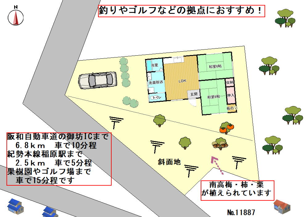 阪和自動車道の御坊ICから車で10分程の場所にある、印南町の山側にある別荘地の物件です。建物は使い勝手の良い2LDKの平家建です。隣の家と少し離れているので、ゆっくりとすごせます。高台に建っていて、南東方向に景色が開けています。のどかな風景を楽しめます。敷地内には梅や柿、栗などの果樹が植えられています。和歌山での海釣りや川釣り、ゴルフなどへの拠点にお勧めの物件です。