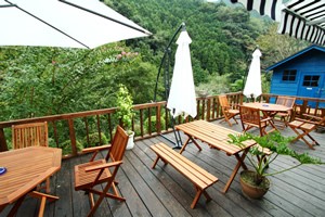 お店は、静かな山里を走るとすぐわかる、青い外壁。一歩中に入るとアンティークの雰囲気。そしておいしそうなケーキ、川を見下ろすウッドデッキの気持ちよさと、何度も驚かされます。