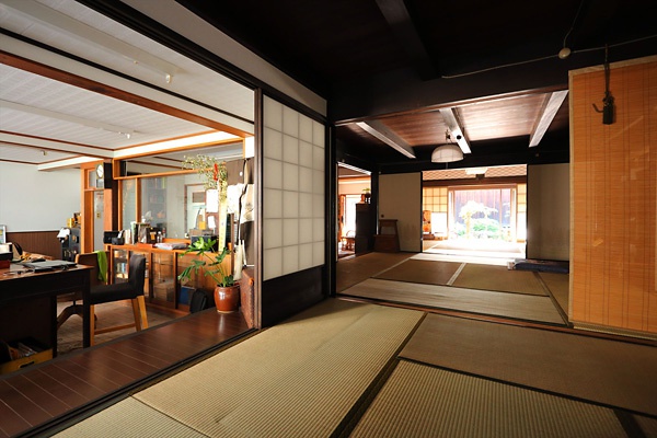 商品を置く倉庫・ガレージもあり、お母様が暮らす平屋の離れもある。ご夫婦が暮らす母屋も広さは十分、お店部分は事務所に。