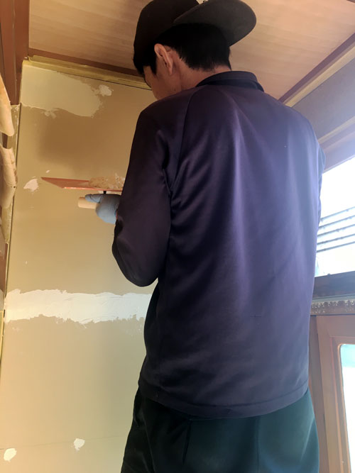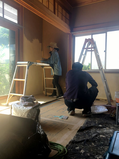 施主のI様が漆喰塗りをしていました。