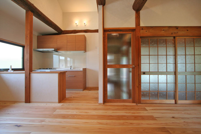 次に、以前にキッチン、洋室、和室があったところを、LDKに間取りを変更しました。約16.5帖の広いLDKに生まれ変わりました。床には30ミリの厚い杉板を使用、とてもナチュラルな雰囲気です。キッチンもおニュウです。
