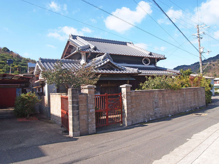 海南市下津インターから車で約5分ぐらいの立地にある古民家。建て方が、錣建て(しころだて)と言って、中2階のある建物です。屋根の下に楕円形の丸い窓がある場所が、ちょうど2階部分です。 錣建ては、見た目に風格があるのと、2階部分の空間部分が、夏の暑さを和らげ、涼しい空間をもたらしています。