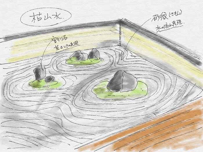 文字通り水を使わないのがルール。石や砂などによって山水の風景を表現しているのが特徴。