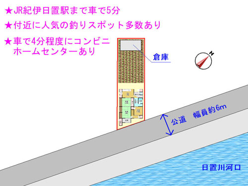 白浜町の日置川の河口辺りにある港町の一角に物件はあります。この辺りは古くから木材の流通場所として栄えてきて、日置川沿いの村々から川を使って木材を運んできて、ここで集めて、船で各地へと運んでいった場所だそうです。今は大型のチヌやグレなど、多くの魚が釣れることもあり、釣り人に人気のスポットとなっています。