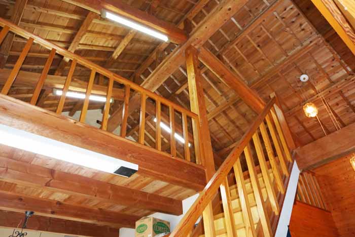 無垢の太い梁がとっても頑丈そうで、安心感を与えてくれます。1階からロフトの勾配天井まで視線が抜けていて、大空間を演出しています。