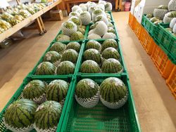地元の産直店ではたくさんのスイカが並んでいました。最近の傾向として、冷蔵庫に収まりやすく少人数の家族でも食べきりやすい小ぶりなスイカがよく売れるのでしょうか。大玉のスイカはほとんど見当たりませんでした。
