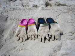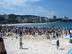 いざ掘り始めるもこのところの曇天ではなくその日に限って晴天。快晴。暑さが体力を奪っていきます。時折、幸運な方々が掘り当てた賞品の紹介がアナウンスされ、気持ちは焦りますが掘っても掘っても砂ばかり。白くサラサラで有名な白浜の砂。穴を深く掘れば周りの砂がなだれ込んできて虚脱感ばかりが深まっていきます。