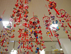 お雛様と一緒に飾られているのは、「さげもん」と呼ばれる飾り物。江戸時代末期より女の子が生まれると、初節句のお祝いに古着の端切れで小物を飾ったのが始まり。小物は鶴や亀、海老など縁起の良いものや、女の子が大好きな手まりやお花など。一つひとつ丁寧に作られた愛らしい小物に、娘の幸せと健康、良縁を願う親心が感じられて、温かで幸せな気持ちになりました。